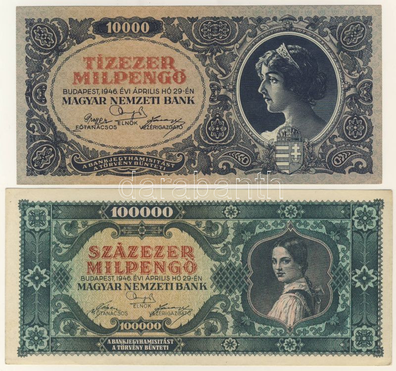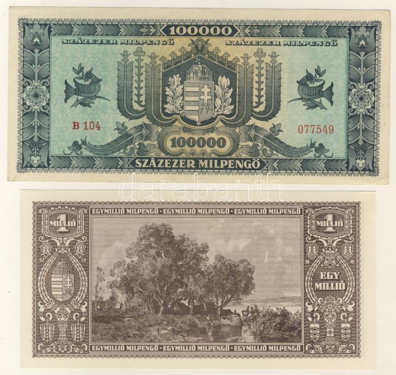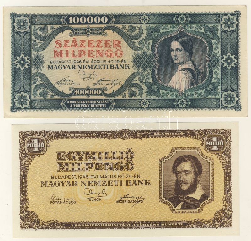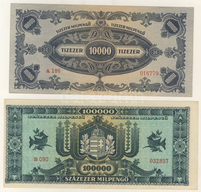 1946. 10.000Milp (1x), 100.000Milp (2x) benne elcsúszott nyomat, 1000.... https://www.darabanth.com/de/69-Fernauktion/69.0/Numismatik/~265/1946-10000Milp-1x-100000Milp-2x-benne-elcsuszott-nyomat-1000000Milp-TI-I-~II132734