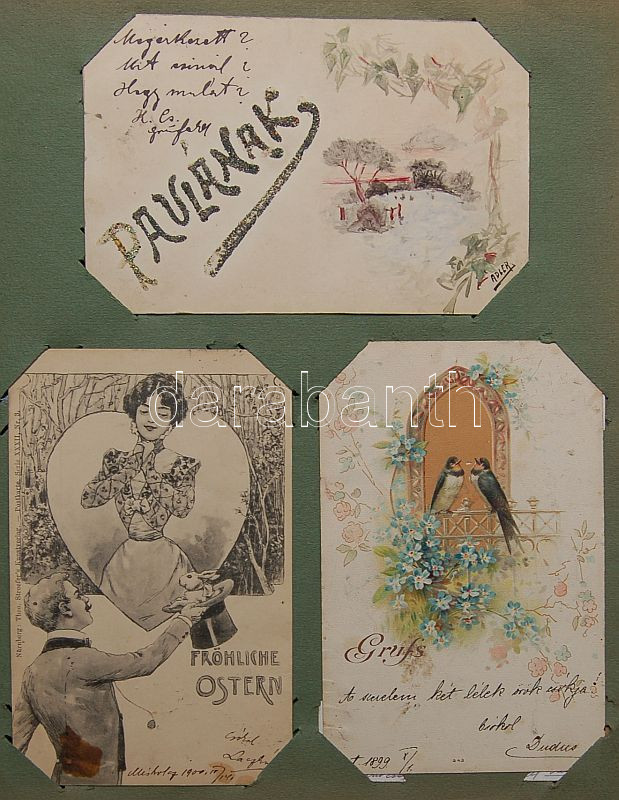 204 db motívum képeslap, döntően az 1900-as évek eljéről, csaknem mind futott, benne szecessziós, dombor, szignált, üdvözlő, virág, fotó, gyerek stb lapok / Phantasy, 204 cards from the beginning of the 20-th century with ladies, children, embossed, greeting cards in album.