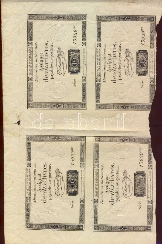 Franciaország 1792. 10Livre összefüggő 4-es tömbben baloldalon a százas bélyegzők mindkettőn erősen jobbra csúszva, az alsó kettőből rossz tépés miatt, sarkok hiányoznak T:gyári gyűrődések, papírráncok állapotot nem lehet meghatározni