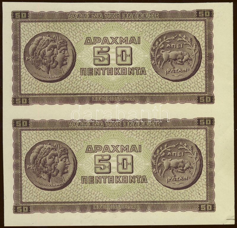 Görögország 1943. 50Dr párban sorozatszám nélküli próbanyomat bal ívné... https://www.darabanth.com/de/73-Fernauktion/73.0/Numismatik/~213/Gorogorszag-1943-50Dr-parban-sorozatszam-nelkuli-probanyomat-bal-ivnel-illesztokeresztte~II146461