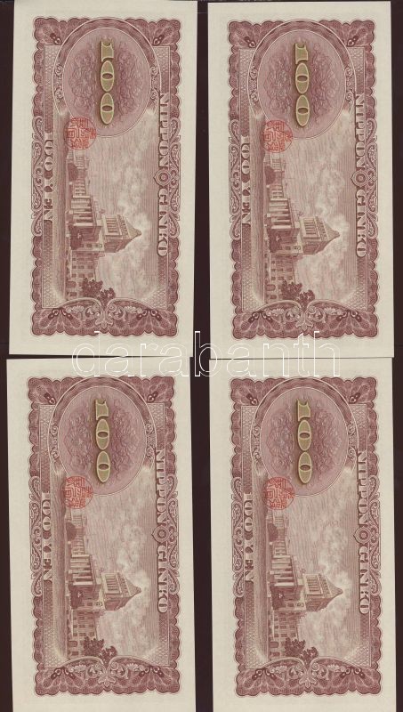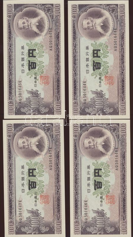 Japán 1953. 100Y (4x) egymásutáni sorszámokkal T:I https://www.darabanth.com/de/73-Fernauktion/73.0/Numismatik/~213/Japan-1953-100Y-4x-egymasutani-sorszamokkal-TI~II146443