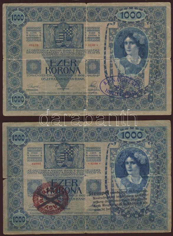 Beschreibung: 1902. 1000K 2klf ellenbélyegzővel: piros "Magyarország" körbélyegző Andráskeresztes fny-sal, "Stempel werde von..." téglalap bélyegzővel + "Kunágotai - 1919 - Hitelintézet" lila oválbélyegzővel T:IV