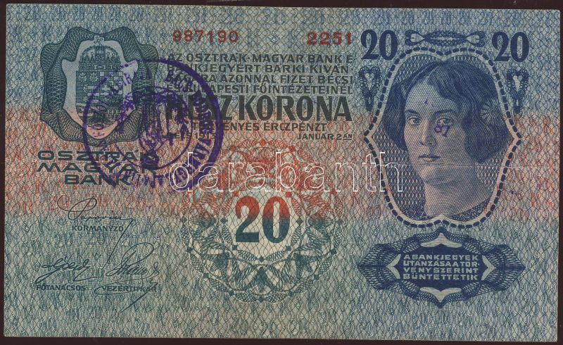 Beschreibung: 1913. 20K "Bács-Bodrog Vármegye Apatini Járás Főszolgabírája" T:II-