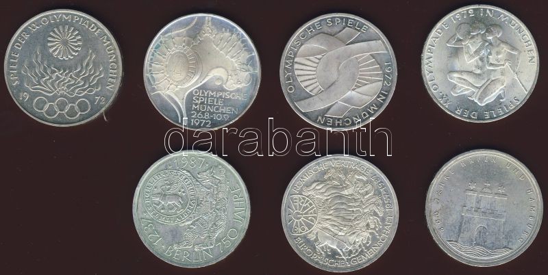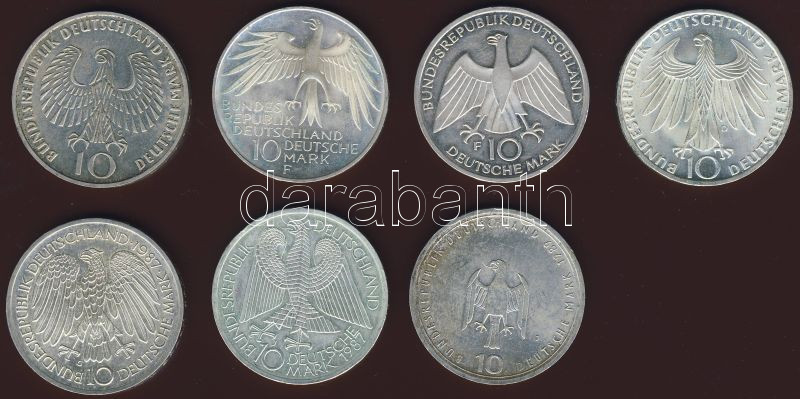 NSZK 1970-80-as évek 10DM Ag 7db klf T:1,2 https://www.darabanth.com/de/74-Fernauktion/74.0/Numismatik/~279/NSZK-1970-80-as-evek-10DM-Ag-7db-klf-T1-2~II147302