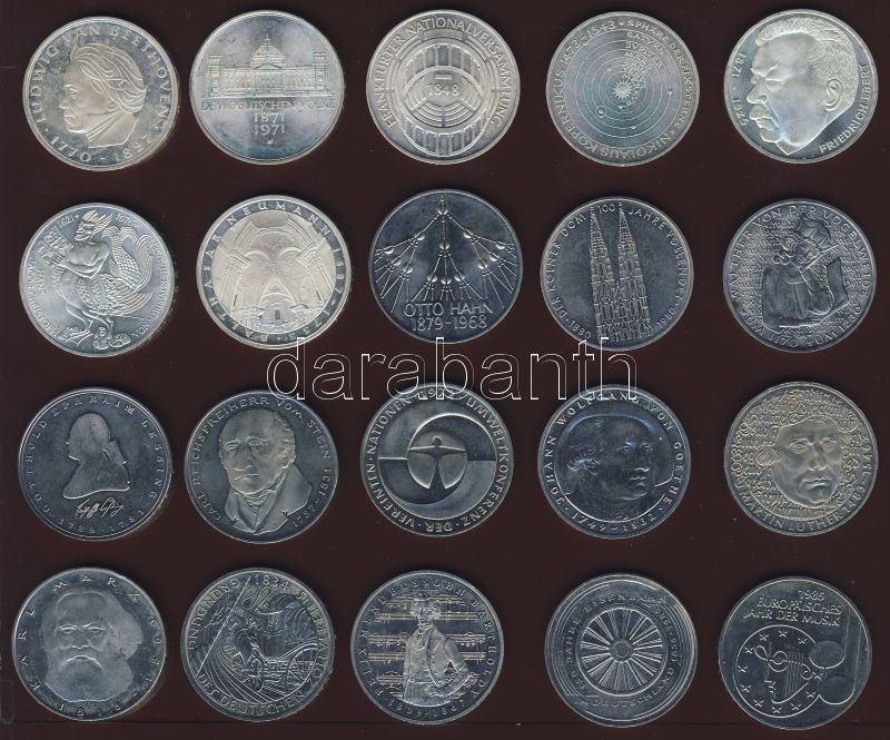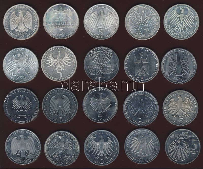 NSZK 1970-80-as évek 5DM (20x) emlékpénz, benne 7db Ag T:1,2 https://www.darabanth.com/de/74-Fernauktion/74.0/Numismatik/~279/NSZK-1970-80-as-evek-5DM-20x-emlekpenz-benne-7db-Ag-T1-2~II147301