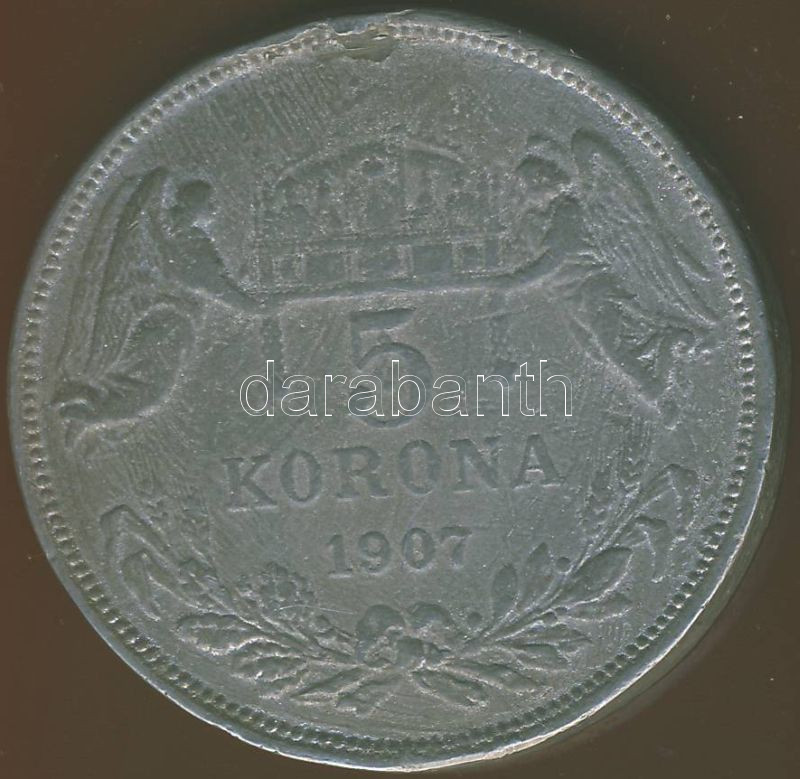 1907. 5K ólom hamisítvány?! T:3 https://www.darabanth.com/de/74-Fernauktion/74.0/Numismatik/~281/1907-5K-olom-hamisitvany-T3~II147695