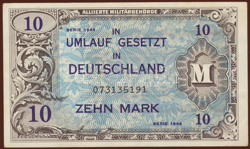 Német 3. Birodalom/nemzetközi megszállás/USA nyomat 1944. 10M T:I- https://www.darabanth.com/de/75-Fernauktion/75.0/Numismatik/~280/Nemet-3-Birodalomnemzetkozi-megszallasUSA-nyomat-1944-10M-TI-~II150960