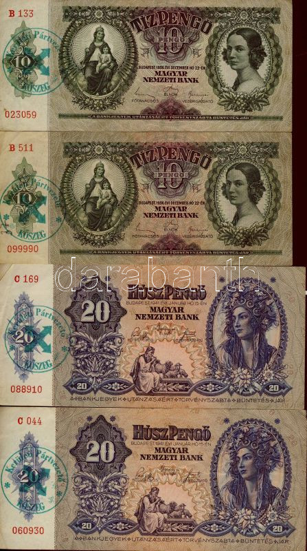 Beschreibung: 1936-1941-1943. 10P (2x) + 20P (2x) + 1000P (1x) hamis? zöld kerületi pártvezető-nyilaskereszt-Kőszeg" ellenbélyegzővel T:2