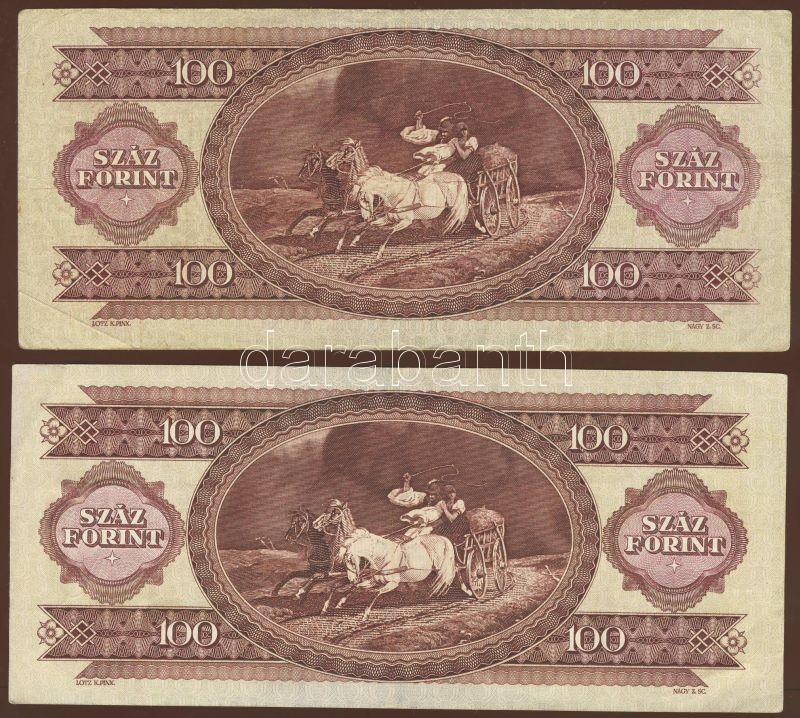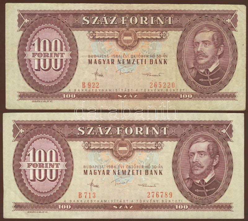 1984. 100Ft (2x) hátlapi alapnyomat fordított "tulipán lefelé"! T:II https://www.darabanth.com/de/75-Fernauktion/75.0/Numismatik/~281/1984-100Ft-2x-hatlapi-alapnyomat-forditott-tulipan-lefele-TII~II148368