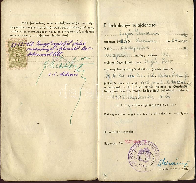 1942 József nádor Műszaki és Gazdaságtudományi Egyetem izraelita hallg... https://www.darabanth.com/de/77-Fernauktion/77.0/Andere-Sammelgebiete/~268/1942-Jozsef-nador-Muszaki-es-Gazdasagtudomanyi-Egyetem-izraelita-hallgatojanak-leckekonyve-~II156069