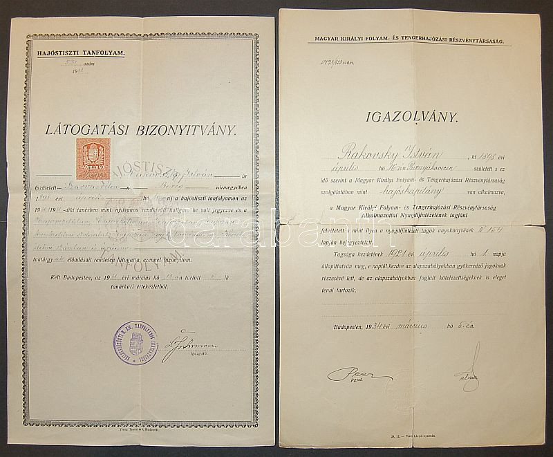 Hajóskapitány óralátogatási igazolása és nyugdíjkötvénye okmánybélyegg... https://www.darabanth.com/de/77-Fernauktion/77.0/Andere-Sammelgebiete/~272/Hajoskapitany-oralatogatasi-igazolasa-es-nyugdijkotvenye-okmanybelyeggel~II156074