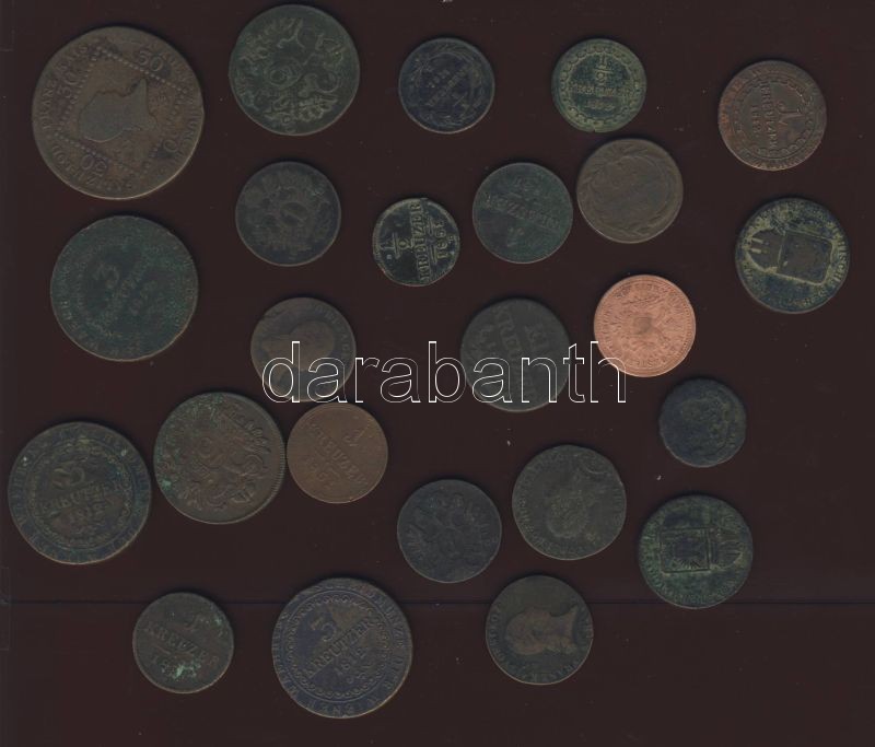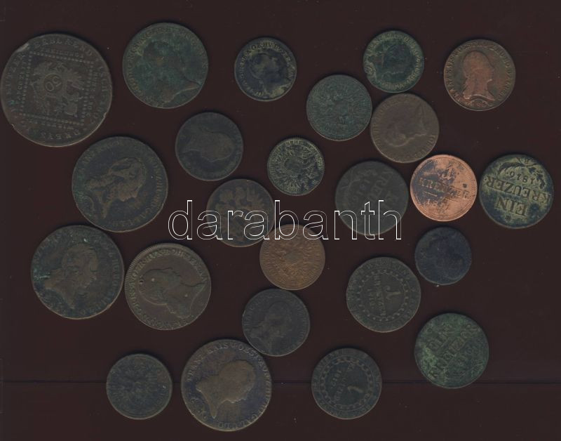 Beschreibung: Kis tétel 1700-1800-as évekből Ausztria/magyar verdejel, sok klf típusban 1/2Kr (4x), 1Kr (14x), 3Kr (5x), 30Kr (1x) összesen 25db T:2/3,3,4 (kevés)