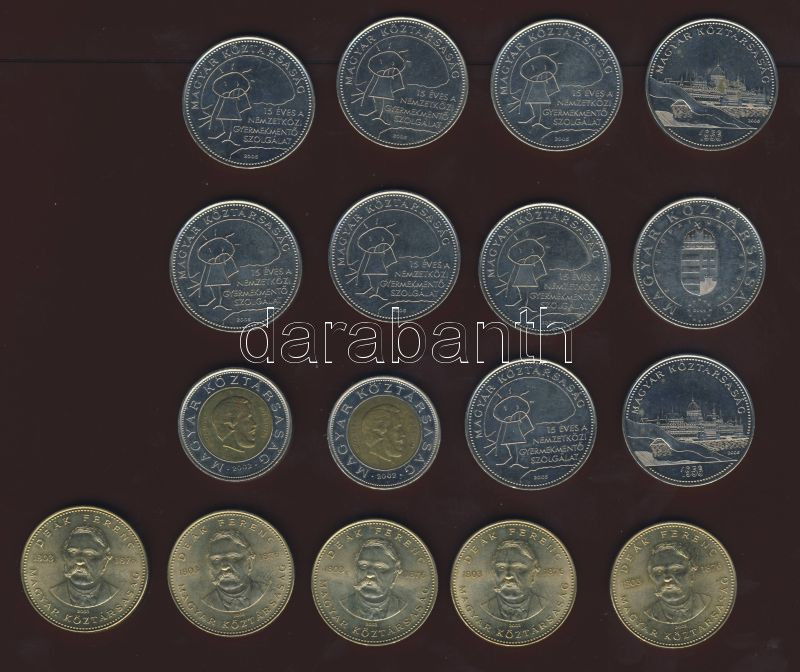Beschreibung: 2002. 100Ft "Kossuth" (2x) + 2003. 20Ft "Deák" (5x) + 2004. 50Ft "EU" (1x) + 2005. 50Ft "Nemzetközi Gyermekmentő Szolgálat" (7x) + 2006. 50Ft "1956" (2x) T:2 Összesen 17db!