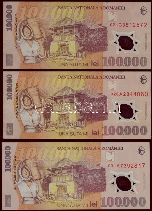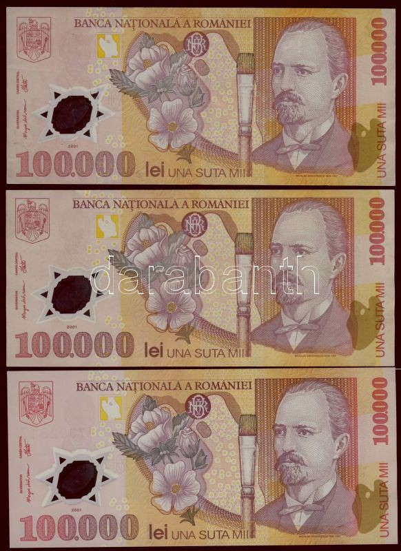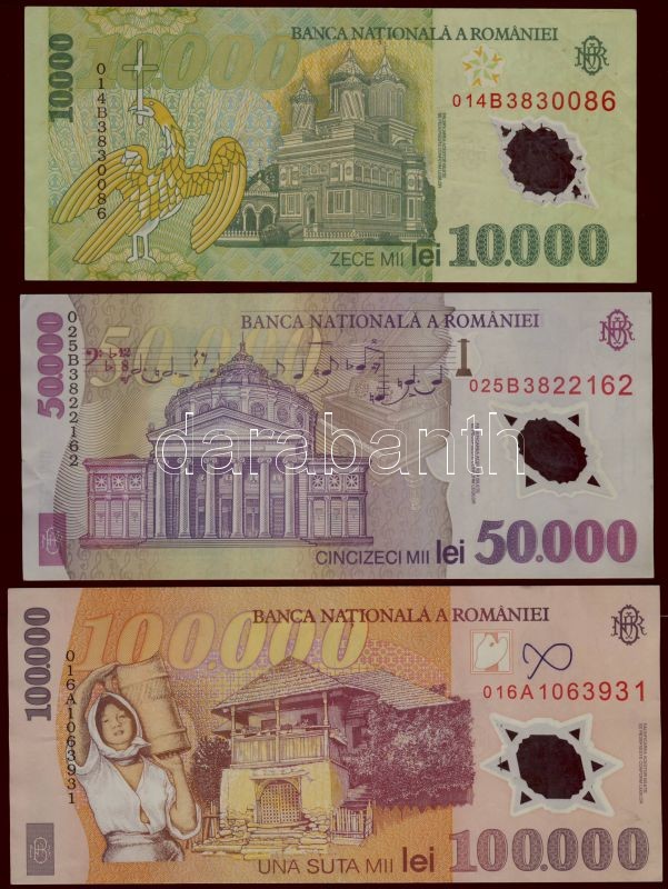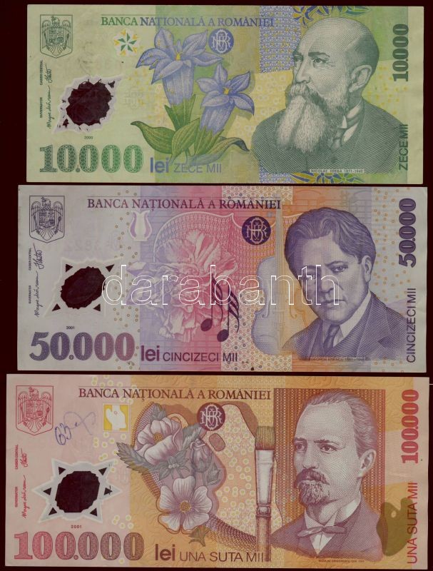 Románia 1999. 2000L + 10.000L (4x) + 2001. 50.000L + 100.000L (4x) T:I... https://www.darabanth.com/de/77-Fernauktion/77.0/Numismatik/~362/Romania-1999-2000L-plus-10000L-4x-plus-2001-50000L-plus-100000L-4x-TII~II152599
