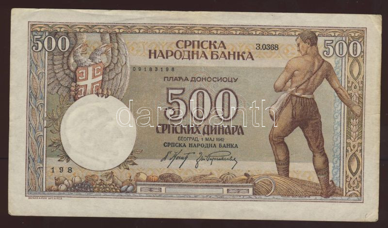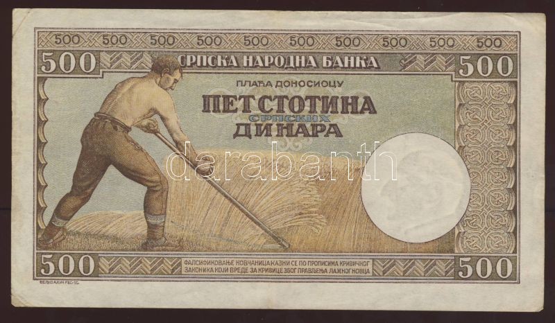 Szerbia/német megszállás 1942. 500D T:II https://www.darabanth.com/de/77-Fernauktion/77.0/Numismatik/~362/Szerbianemet-megszallas-1942-500D-TII~II154522