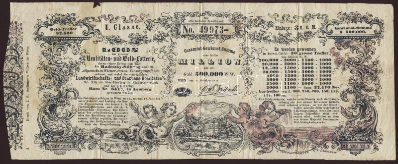 Ausztria 1851. Lotterie (Sorsjegy) Radetzky Alapítvány I.Osztály 3Fl á... https://www.darabanth.com/de/77-Fernauktion/77.0/Numismatik/~364/Ausztria-1851-Lotterie-Sorsjegy-Radetzky-Alapitvany-IOsztaly-3Fl-arban-T23-RR~II155225