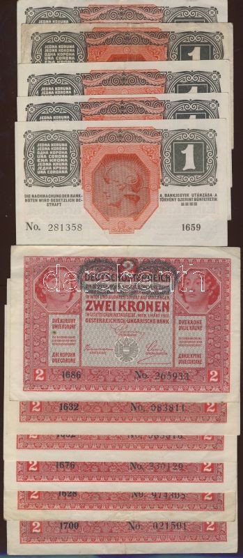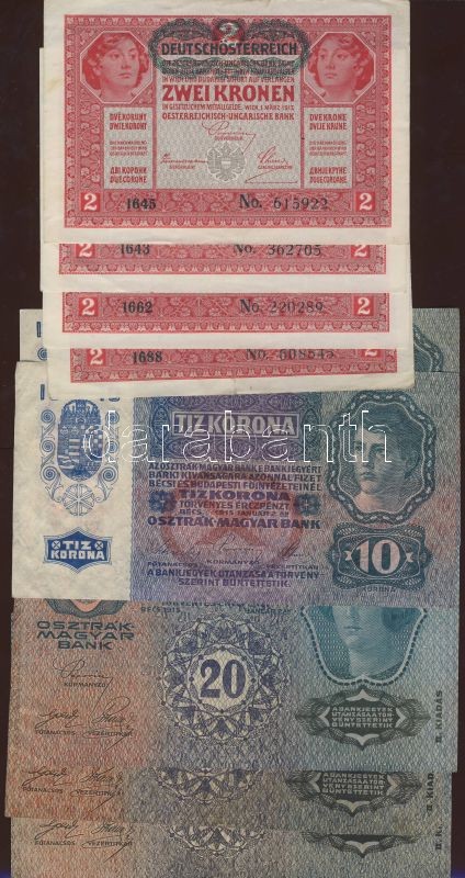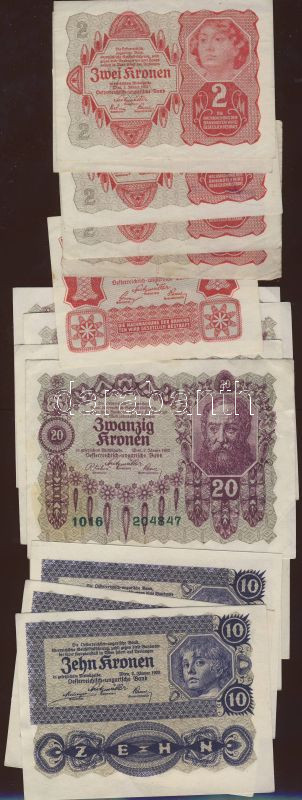 1902-17. 1K (15x, 2klf), 10K (2x), 20K (3x), 100K (4x), 1000K (1x) mind "Deutschösterreich" fny-sal + Osztrák-magyar Bank 1922. 1K (1x), 2K (5x), 10K (5x), 20K (4x) T:I-,II+,II