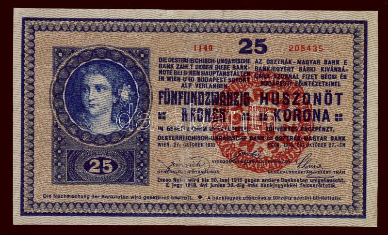 1918. 25K piros "Magyarország" körbélyegzővel T:restaurált https://www.darabanth.com/de/77-Fernauktion/77.0/Numismatik/~365/1918-25K-piros-Magyarorszag-korbelyegzovel-Trestauralt~II155374