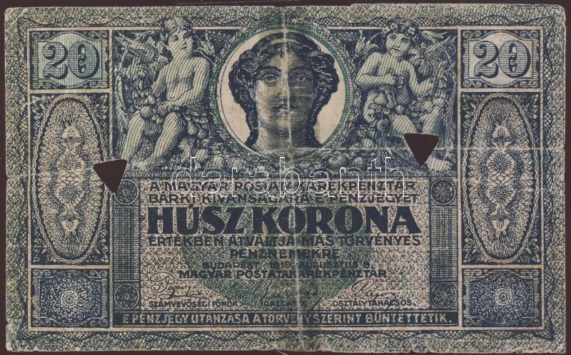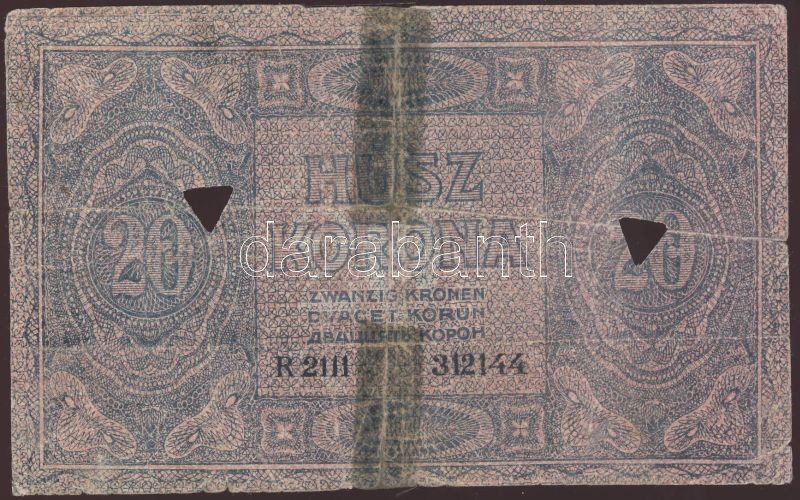 1919. 20K korabeli hamisítvány 2db háromszög érvénytelenítéssel T:raga... https://www.darabanth.com/de/77-Fernauktion/77.0/Numismatik/~365/1919-20K-korabeli-hamisitvany-2db-haromszog-ervenytelenitessel-Tragasztott-restauralt~II156066
