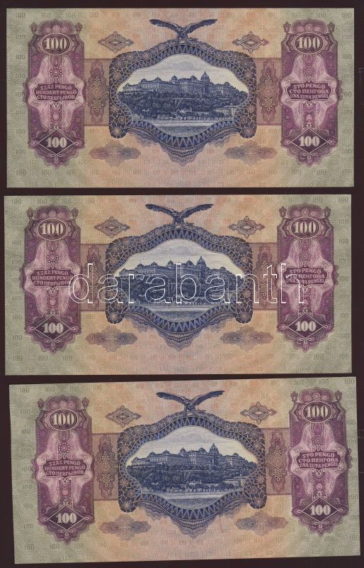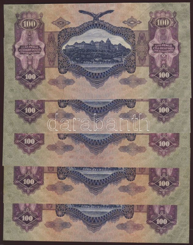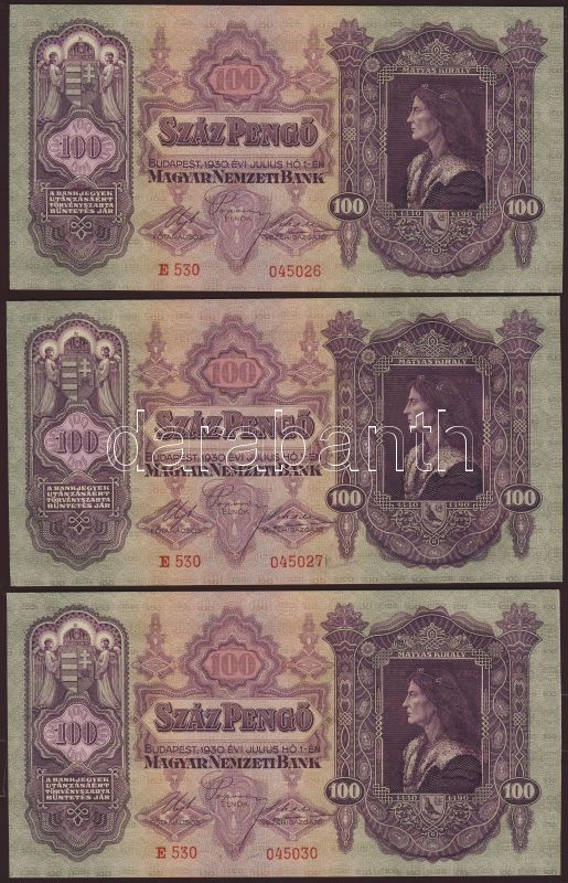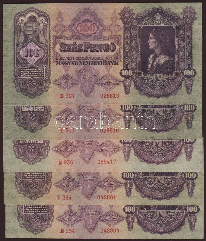 1930. 100P (8x) benne egymásutáni, ill. kevés úgrású sorszámok T:I https://www.darabanth.com/de/77-Fernauktion/77.0/Numismatik/~365/1930-100P-8x-benne-egymasutani-ill-keves-ugrasu-sorszamok-TI~II153102