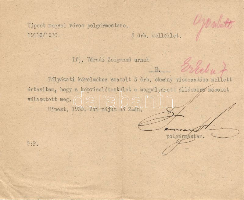 Beschreibung: 1930 Semsey újpesti polgármester aláírása levélen