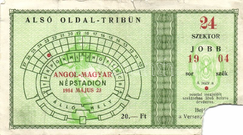 Beschreibung: 1954 belépőjegy a Népstadionba az Angol-Magyar football-mérkőzésre (a meccs a híres 6:3 visszavágója volt és Magyarország 7:1 arányban nyert)