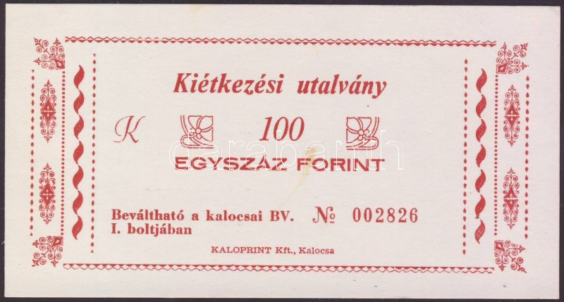 Beschreibung: Kalocsa/börtönpénz "Kiétkezési utalvány" 100Ft hátoldali "Kalocsai Fegyház és Börtön.." bélyegzővel T:I