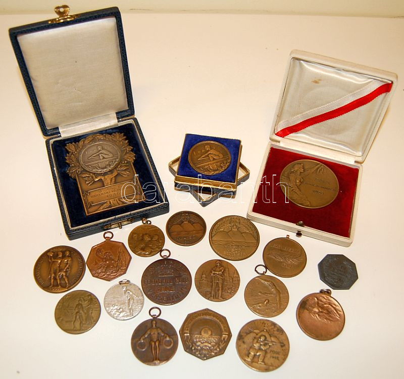 Beschreibung: 17db klf úszó helyezési, ill. részvételi érem 1895-től, beleőlük 3db díszdobozban + 1933. Vívó Eb részvételi érem + 1943. Lövészet részvételi érem