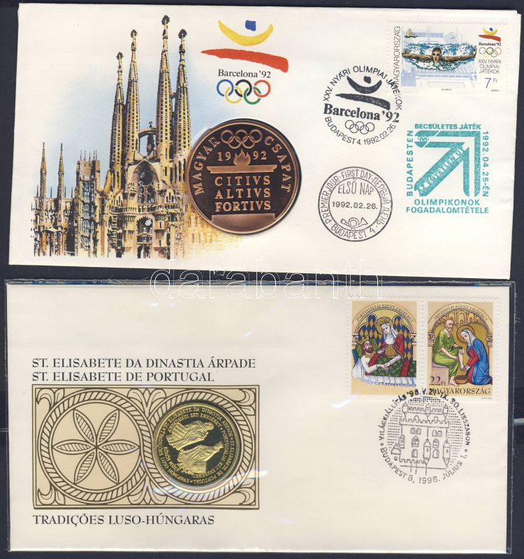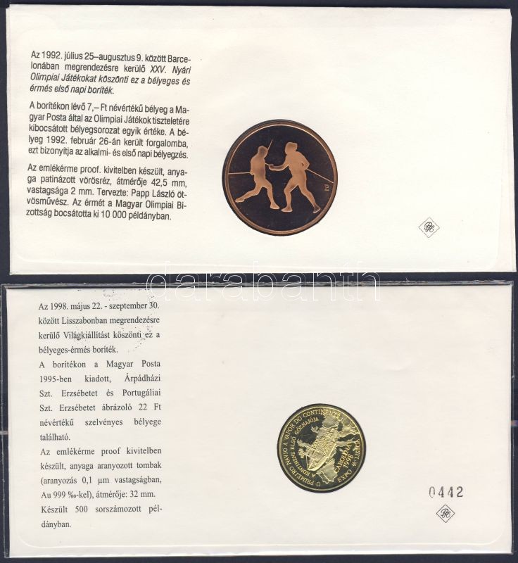 Beschreibung: 1992. "Barcelona" érmés boríték elsőnapi bélyegzővel T:PP+ 1998. "Világkiállítás-Szt.Erzsébet" érmés boríték elsőnapi bélyegzővel, csak 500db! RR!! T:PP