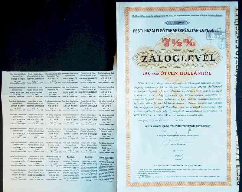 1927. "Pesti Hazai Első Takarékpénztár-Egyesület" záloglevele 50$-ról,... https://www.darabanth.com/de/78-Fernauktion/78.0/Numismatik/~305/1927-Pesti-Hazai-Elso-Takarekpenztar-Egyesulet-zaloglevele-50USD-rol-szelvenyekkel~II158224