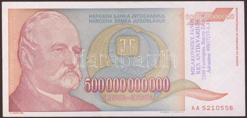 Jugoszlávia 1993. 500.000.000.000D Hungarika! "Milakovszky János" bély... https://www.darabanth.com/de/78-Fernauktion/78.0/Numismatik/~310/Jugoszlavia-1993-500000000000D-Hungarika-Milakovszky-Janos-belyegzovel-TIIplus~II158105