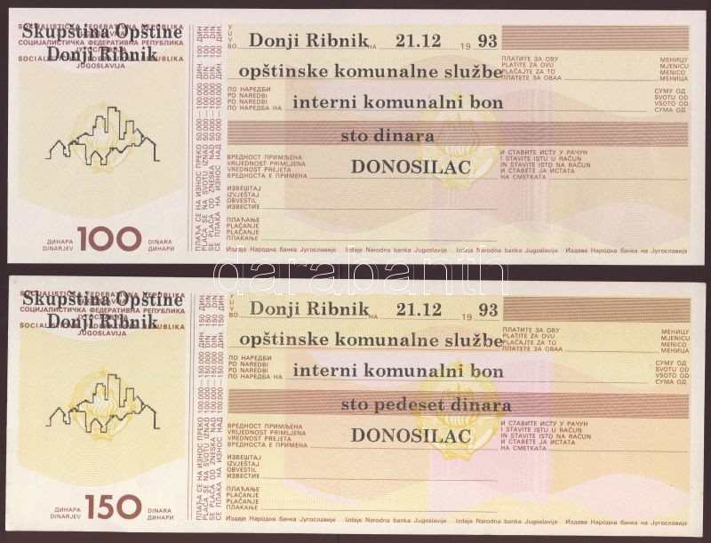 Jugoszlávia 1993. teljes bon sor "Donji Ribnik" 5 klf darab T:I https://www.darabanth.com/de/78-Fernauktion/78.0/Numismatik/~310/Jugoszlavia-1993-teljes-bon-sor-Donji-Ribnik-5-klf-darab-TI~II156797