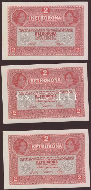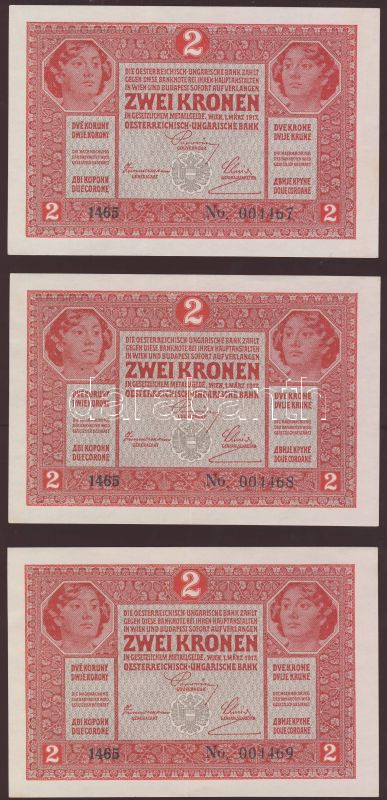 1917. 2K (3x) egymásutáni sorszámmal T:II+ Egyszer hajtva! https://www.darabanth.com/de/78-Fernauktion/78.0/Numismatik/~311/1917-2K-3x-egymasutani-sorszammal-TIIplus-Egyszer-hajtva~II158626