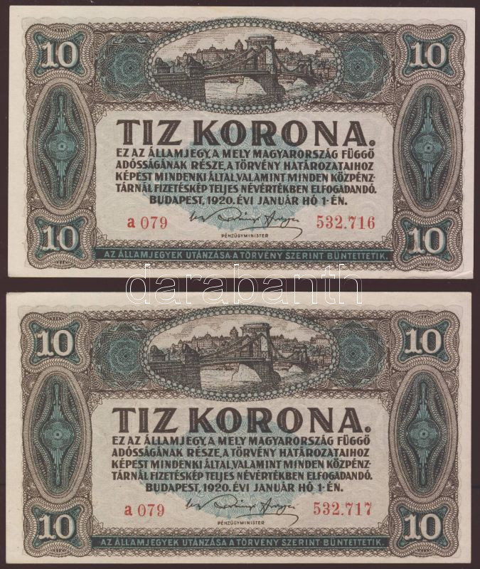 1920. 10K (2x) egymásutáni sorszámokkal T:I,I- https://www.darabanth.com/de/78-Fernauktion/78.0/Numismatik/~311/1920-10K-2x-egymasutani-sorszamokkal-TI-I-~II157720