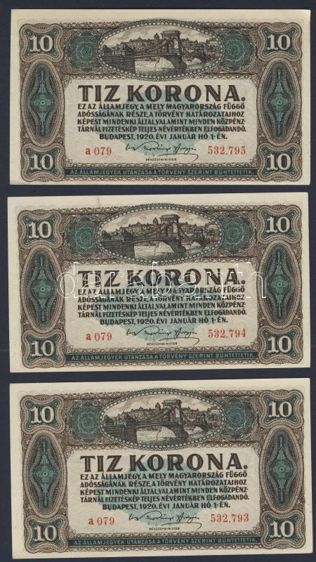 1920. 10K (2x) egymásutáni sorszámokkal T:I,I- https://www.darabanth.com/de/78-Fernauktion/78.0/Numismatik/~311/1920-10K-2x-egymasutani-sorszamokkal-TI-I-~II157723
