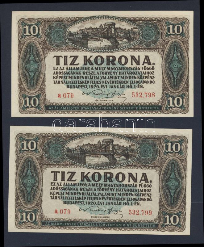 1920. 10K (2x) egymásutáni sorszámokkal T:I,I- https://www.darabanth.com/de/78-Fernauktion/78.0/Numismatik/~311/1920-10K-2x-egymasutani-sorszamokkal-TI-I-~II157724