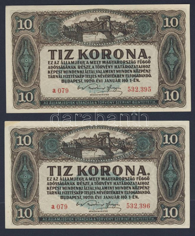 1920. 10K (2x) egymásutáni sorszámokkal T:I,I- https://www.darabanth.com/de/78-Fernauktion/78.0/Numismatik/~311/1920-10K-2x-egymasutani-sorszamokkal-TI-I-~II157727