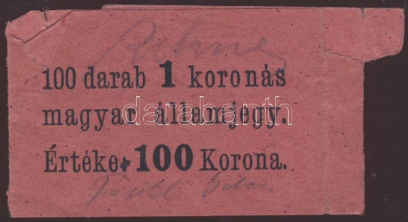 Beschreibung: 1920. 1K (11x) egymásutáni sorszámokkal "sorozatszámok és számok" erősen ferdén nyomva T:I,I- (Csak 1db!) + korabeli nyomtatott bankjegyszalag!