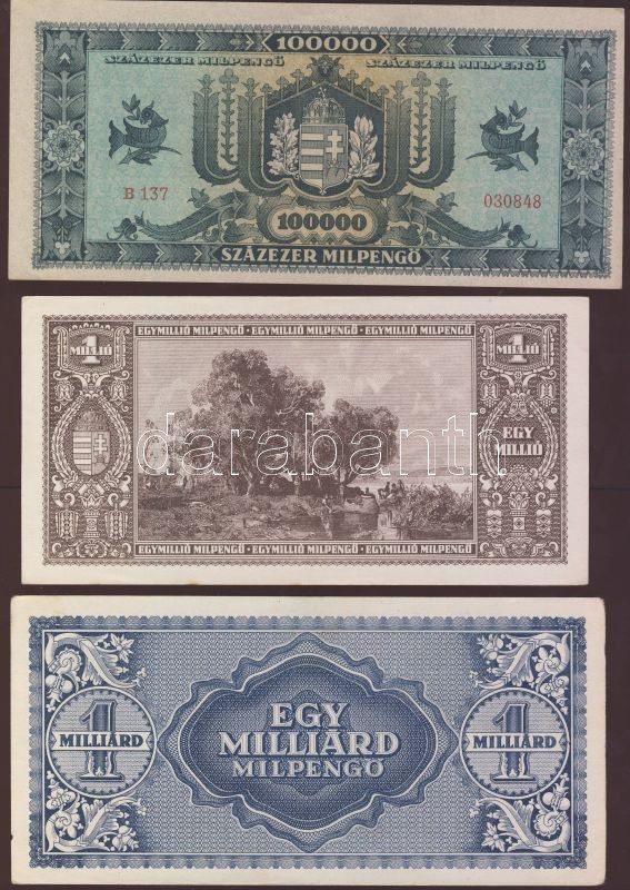 1946. 100.000 Milpengő + 1.000.000 Milpengő + 1.000.000.000 Milpengő T... https://www.darabanth.com/de/78-Fernauktion/78.0/Numismatik/~311/1946-100000-Milpengo-plus-1000000-Milpengo-plus-1000000000-Milpengo-TI-~II158857
