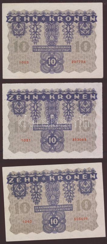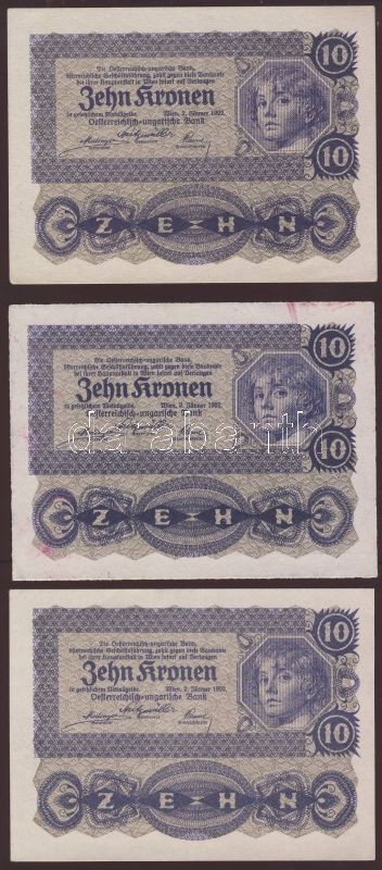 Ausztria/Osztrák-Magyar Bank 1922. 10K (3x) T:II+ Csak egyszer hajtva! https://www.darabanth.com/de/78-Fernauktion/78.0/Numismatik/~311/AusztriaOsztrak-Magyar-Bank-1922-10K-3x-TIIplus-Csak-egyszer-hajtva~II158584