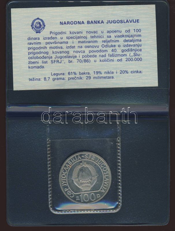 Jugoszlávia 1985. 100D "Felszabadulás" T:PP Eredeti dísztokban, tanúsí... https://www.darabanth.com/de/78-Fernauktion/78.0/Numismatik/~316/Jugoszlavia-1985-100D-Felszabadulas-TPP-Eredeti-disztokban-tanusitvannyal~II157308