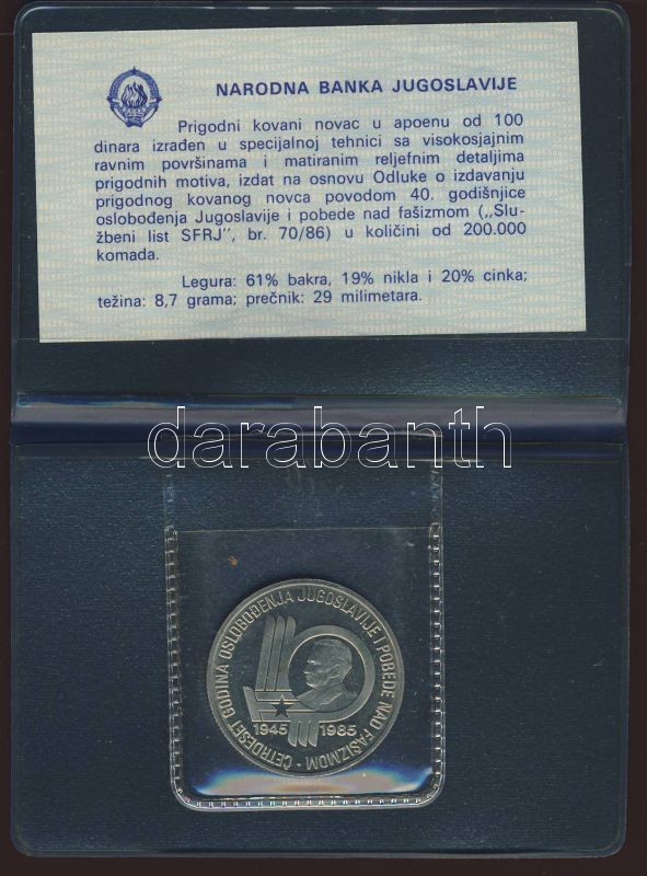 Beschreibung: Jugoszlávia 1985. 100D "Felszabadulás" T:PP Eredeti dísztokban, tanúsítvánnyal!