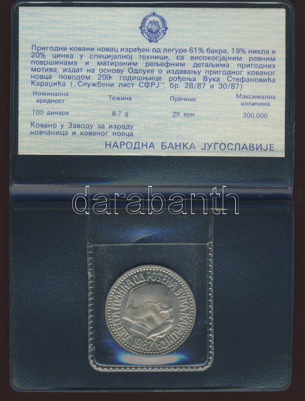 Jugoszlávia 1985. 100D "Karajich" T:PP Eredeti dísztokban, tanúsítvánn... https://www.darabanth.com/de/78-Fernauktion/78.0/Numismatik/~316/Jugoszlavia-1985-100D-Karajich-TPP-Eredeti-disztokban-tanusitvannyal~II157300