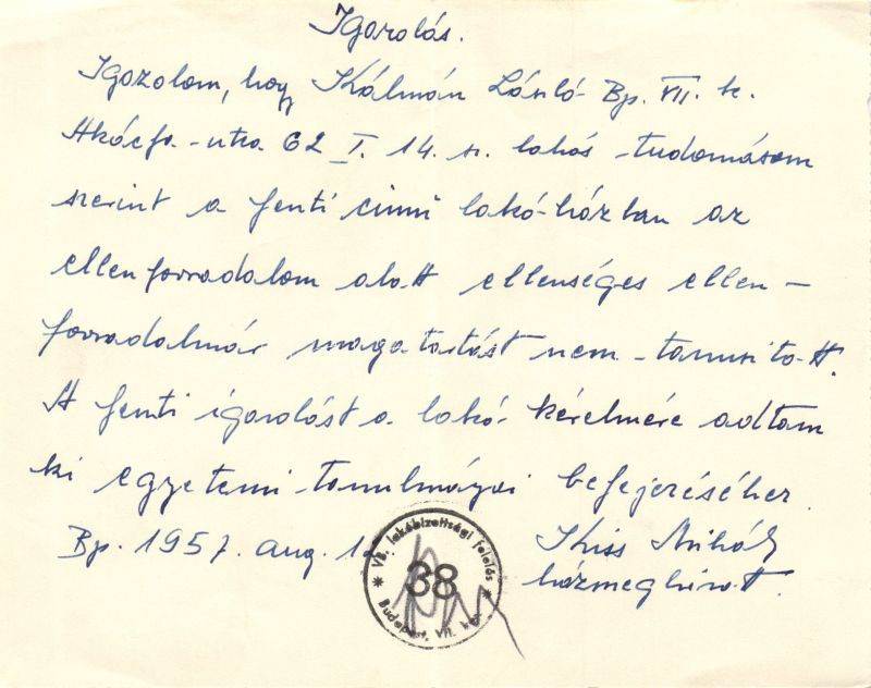 Beschreibung: 1957 házmegbízotti igazolás az 1956-os forradalom alatti magatartásról, egyetemi tanulmányokhoz