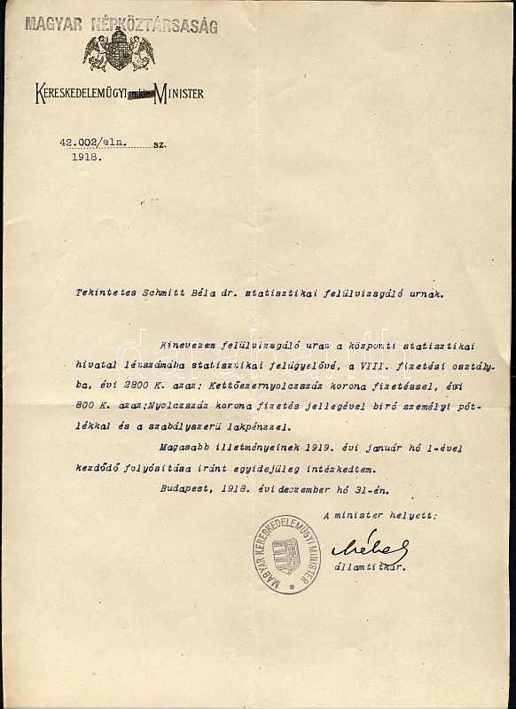 Beschreibung: 1918 Méhely Kálmán. mérnök, közgazdasági és szociálpolitikai író, államtitkár aláírása hivatalos levélen