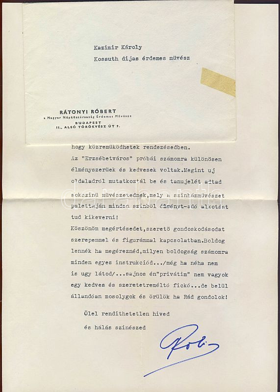 Beschreibung: Rátonyi Róbert színész által Kazimir Károlynak írt gratuláló levél