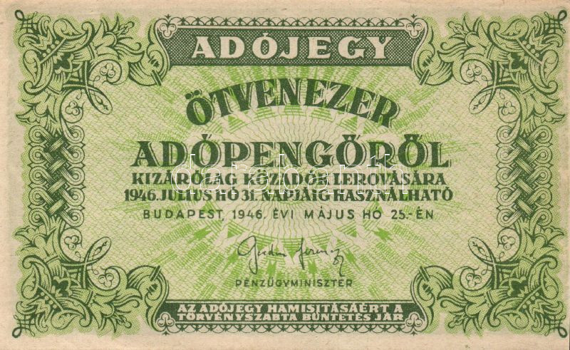 1946. 50.000AP hátlapi vékonybetűs szöveggel, a szövegben a legtöbb he... https://www.darabanth.com/de/79-Fernauktion/79.0/Numismatik/~338/1946-50000AP-hatlapi-vekonybetus-szoveggel-a-szovegben-a-legtobb-helyen-a-betukon-nics-e~II159696