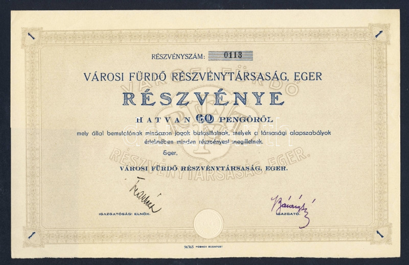 Eger Városi fürdő RT. 60 p részvény / Decorative share https://www.darabanth.com/de/8-Gross-Auktion/8.1/Kunst-Dokumente/~2222/Eger-Varosi-furdo-RT-60-p-reszveny-Decorative-share~II213383