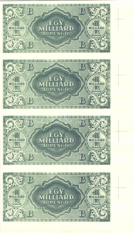 Beschreibung: 1946. 1000.000.000B.-pengő "zöld" jobb ívszéli 4-es függőleges csíkban, csak hátoldali nyomat, 4db illesztőkereszttel! T:I