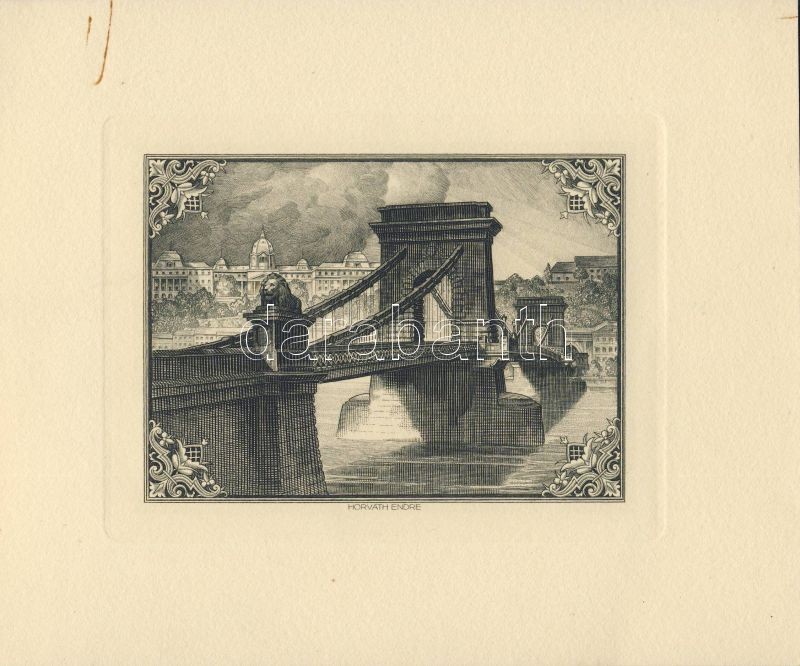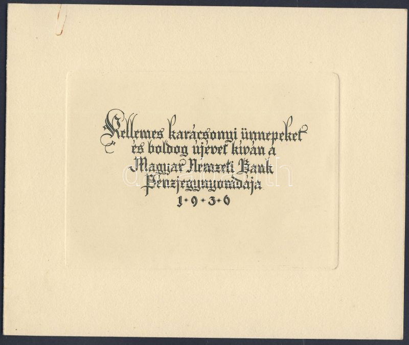 Beschreibung: 1936. Az 1925-ös 5P-s bankjegy el nem fogadott tervezete, mint az "MNB" pénzjegynyomdájának karácsonyi meghívóján ábrázolt rézkarc (Lánchíd) T:I